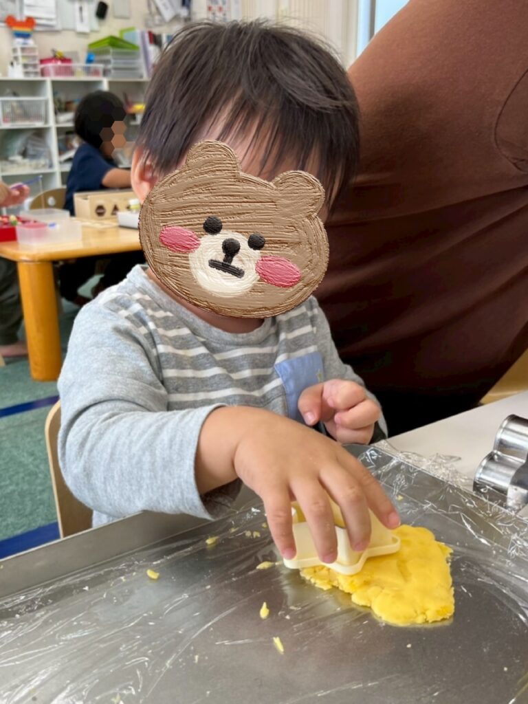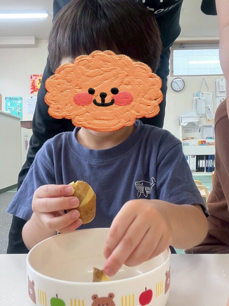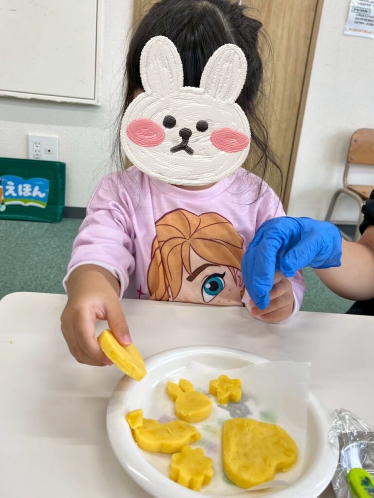 収穫したお芋で、型抜きをして作ったいも団子を食べたり、おやつの時間に茹でてマヨネーズやオーロラソースをかけて食べたりしました。子ども達はおいしいと大喜び🎵