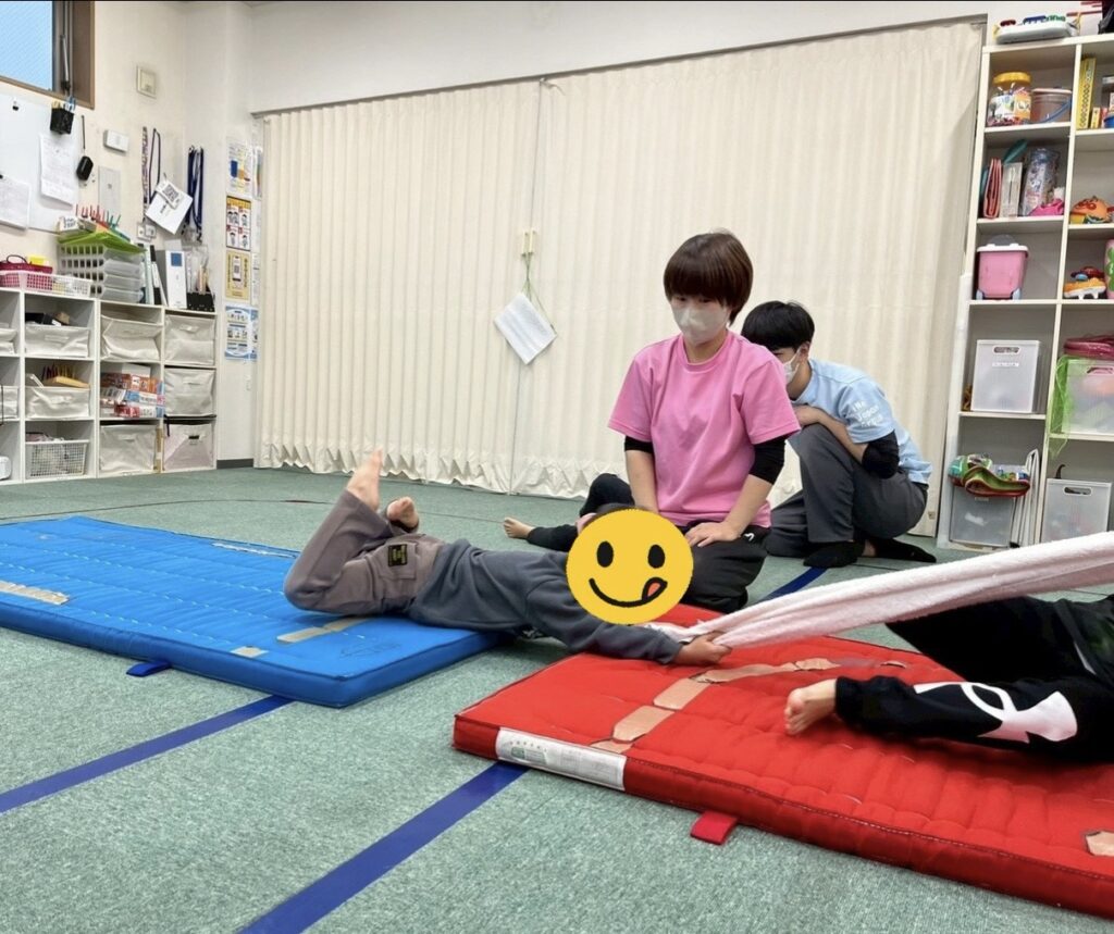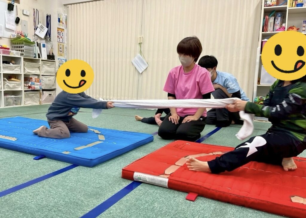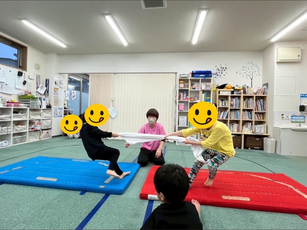 これは反射神経を鍛えるだけではなく、タオルを同時に持った時に引っ張り寄せる筋力、バランスを取りながら引っ張られる事に対して耐える体幹など1つの遊びで様々な部分を鍛える事が期待されます✨
